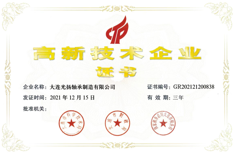 • 大連光揚軸承制造有限公司順利通過“高新技術企業(yè)”復審認定,并收到了大連市科學技術局、大連市財政局、國家稅務總局大連市稅務局聯(lián)合頒發(fā)的《高新技術企業(yè)證書》。 高新技術企業(yè)是國家為鼓勵高新技術企業(yè)發(fā)展,調(diào)整產(chǎn)業(yè)結構和提升國家經(jīng)濟競爭力而設立的專項資質(zhì)認定,具有極高的含金量。 此次通過高新技術企業(yè)復審認定,既是對光揚軸承近年來發(fā)展的認可,也是對公司科研創(chuàng)新能力和技術實力的充分肯定。